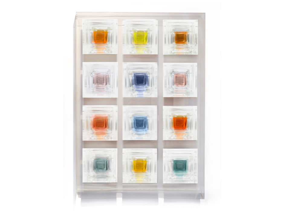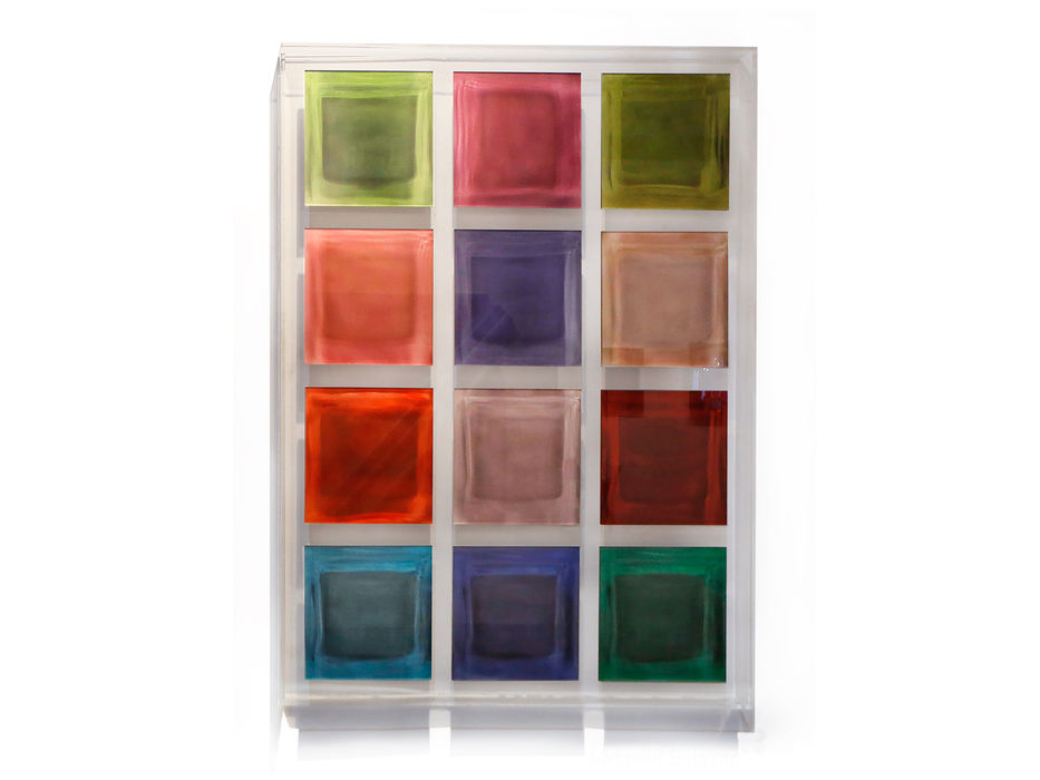 Exploring the potentiality of color and geometrical forms in contemporary art practice, the artist connects the longtime tradition of the reticular structure to her research on photography as a medium to produce new pictorial perceptions. In these artworks, color is the result of a physical experimentation with water, pigments, and the effects of the combined processes of refraction - reflection.
